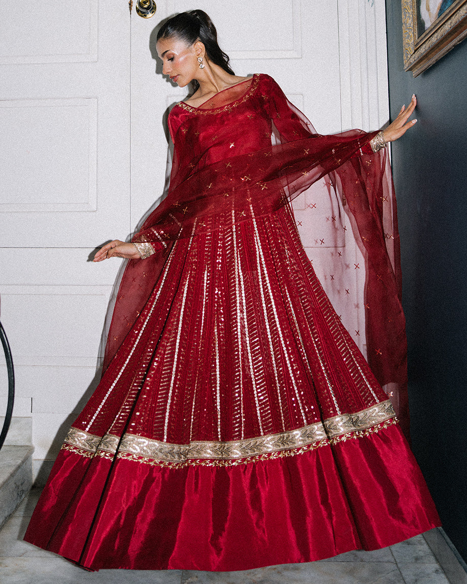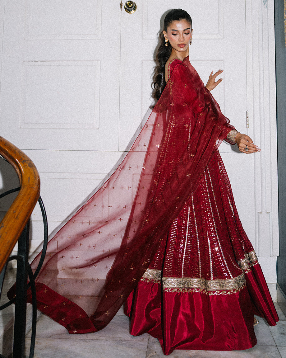 A regal deep red soft silk anarkali paired with a pure soft organza dupatta and churidaar trouser. Handwork adorns the neckline, hem, and flows across the dupatta, finished with lace detailing on the sleeves and bottom. Designed with a side zip for a flattering fit and a soft silk churidaar for graceful movement.