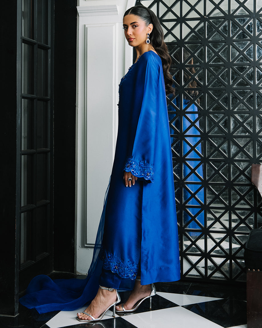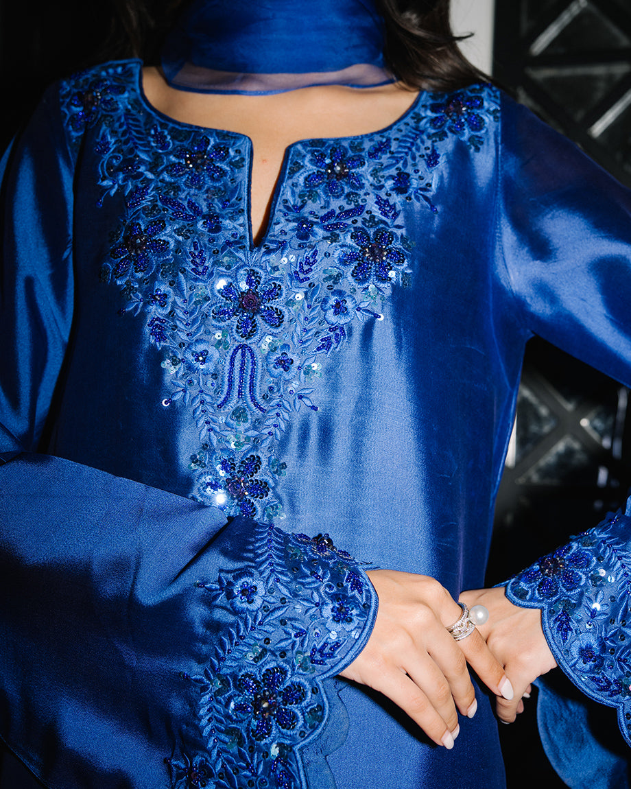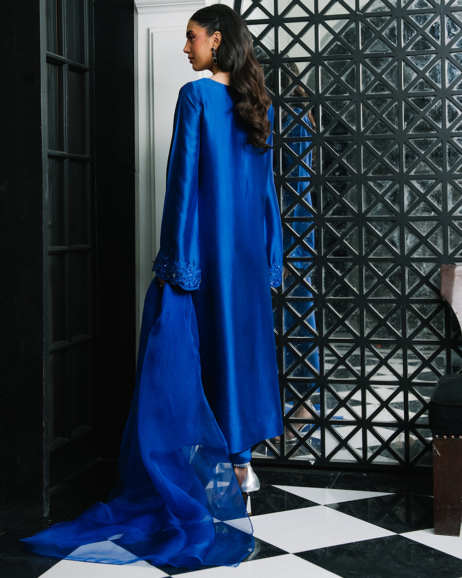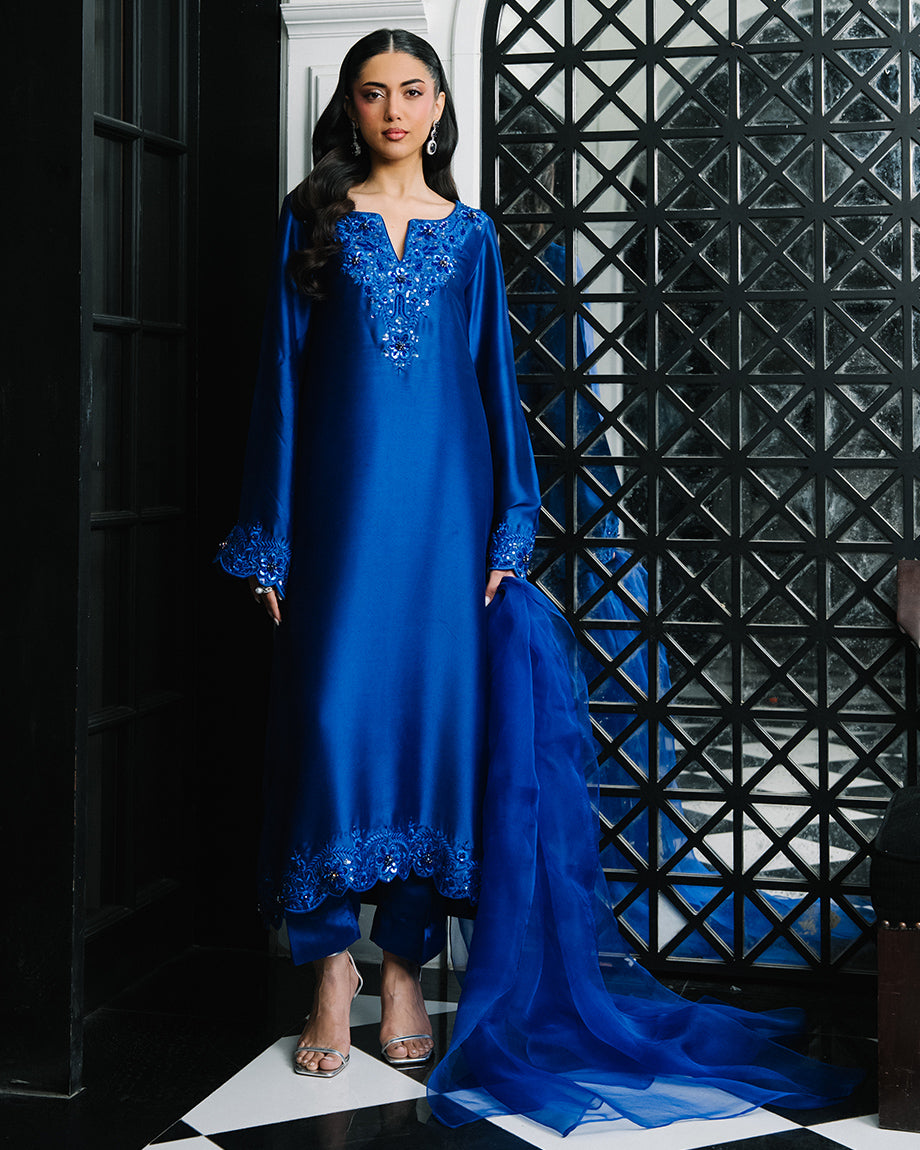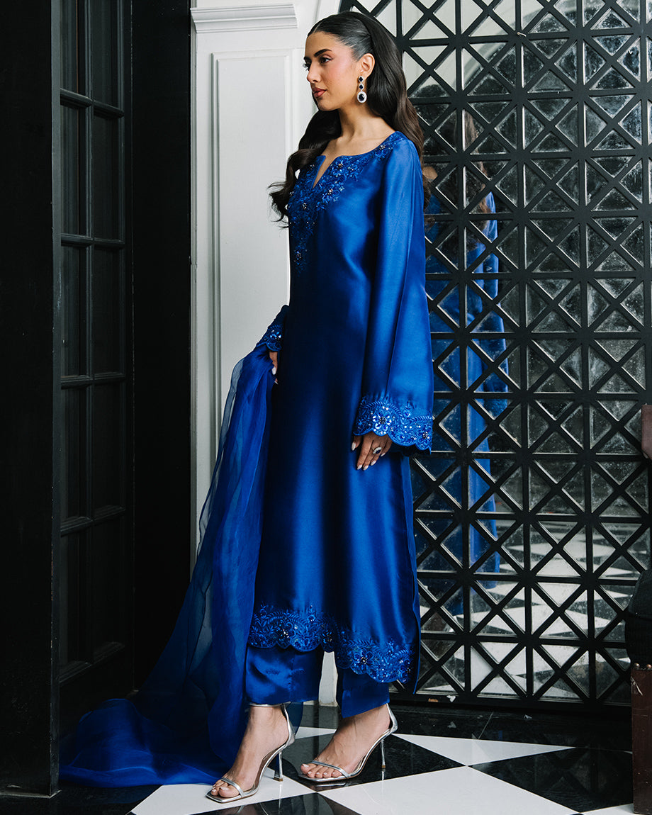 An electric blue 3-piece set featuring a pure sheesha silk shirt and trousers with inner lining, paired with a pure organza dupatta. Adorned with tonal resham and handwork for a seamless, polished finish, offering a structured and flowing silhouette.