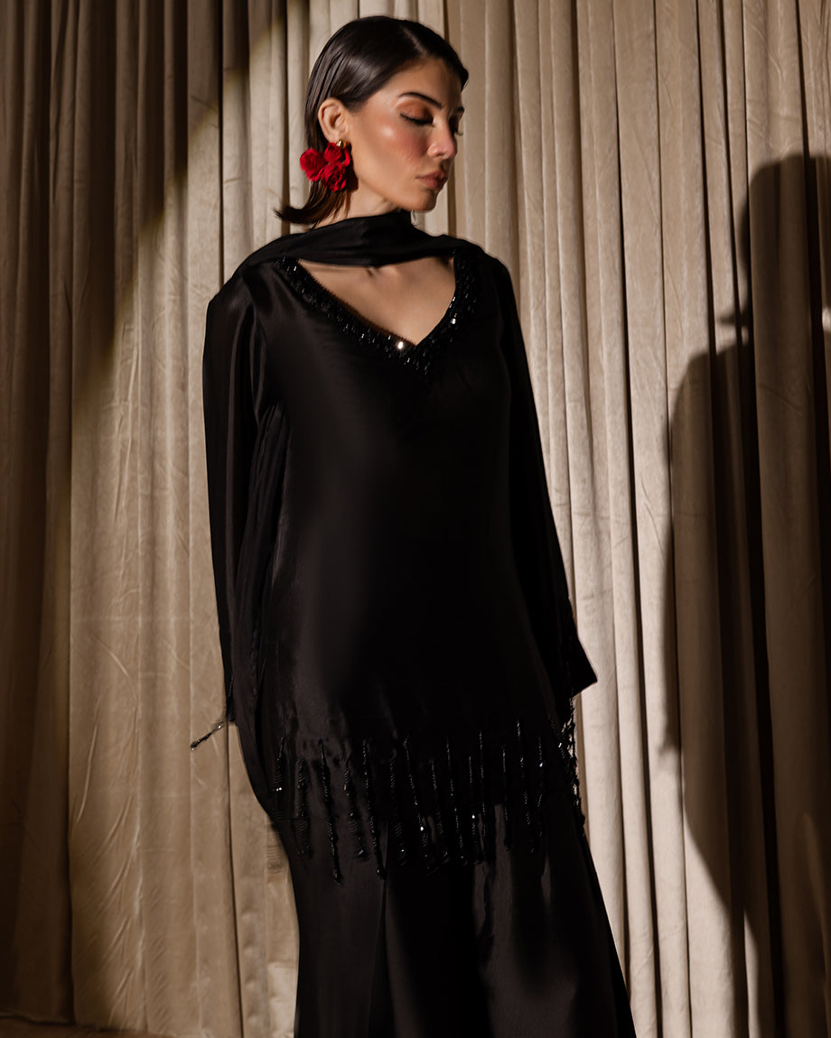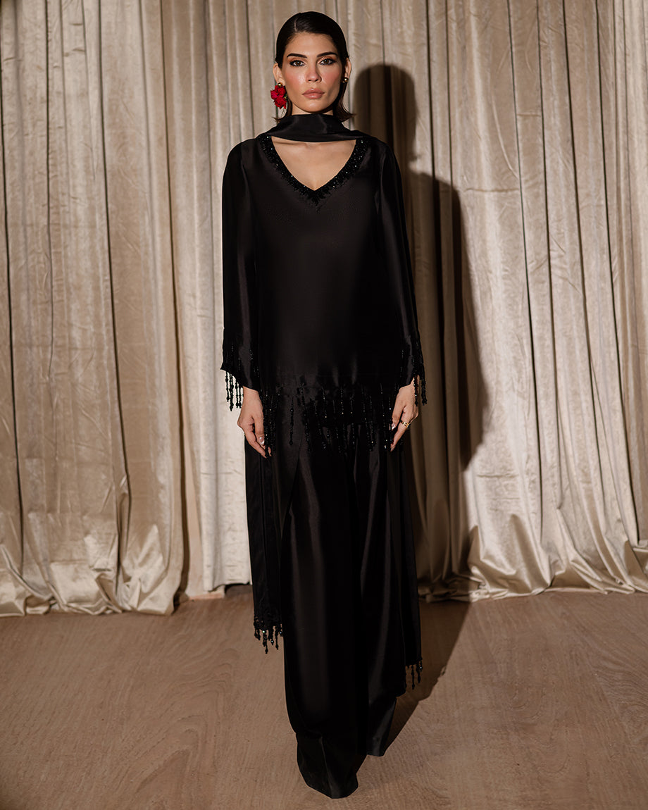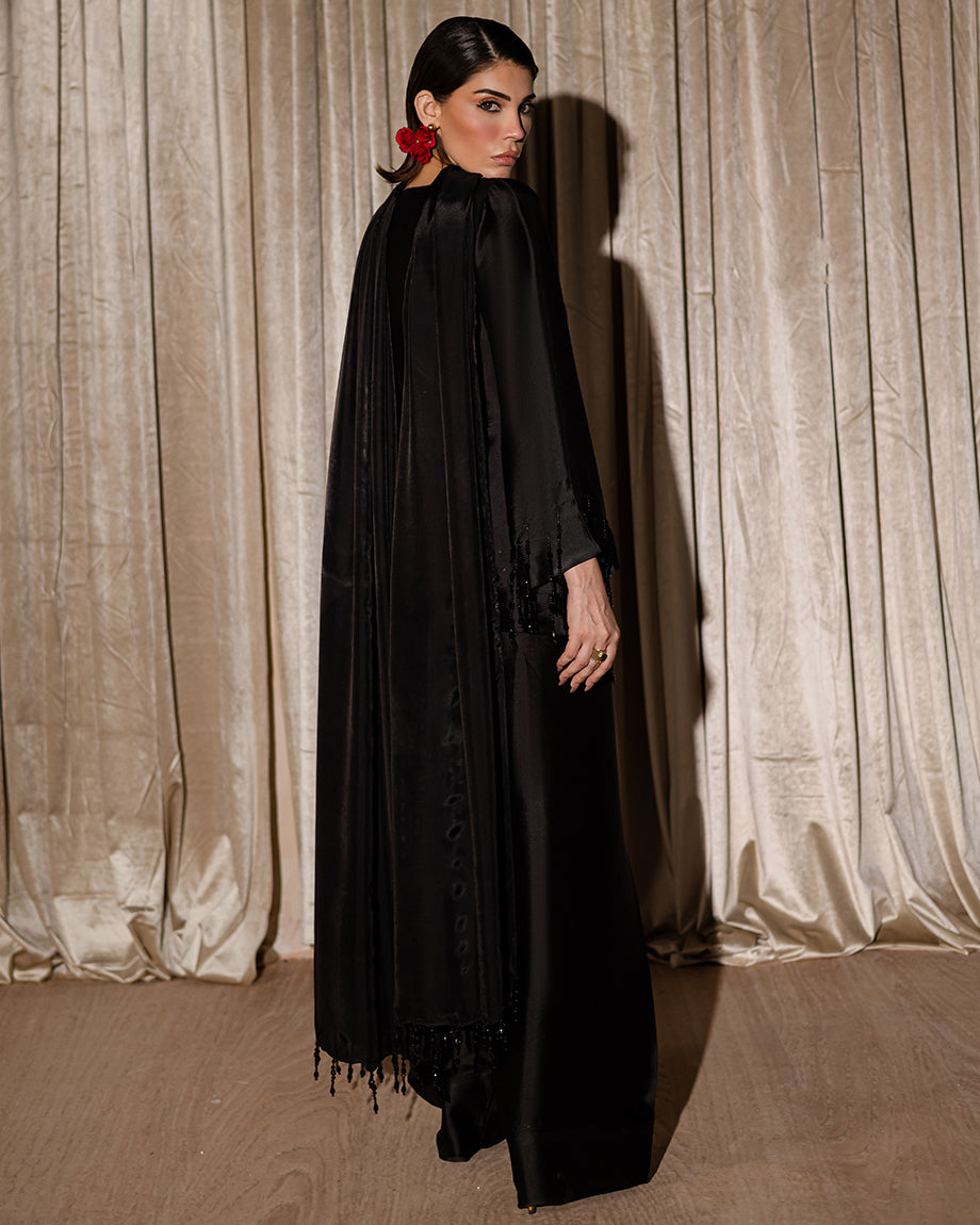An elegant all-black ensemble featuring a sheesha silk farshi shalwar, detailed with black-on-black work along the neckline. Tassels on the shirt, sleeves, and dupatta add graceful movement, bringing life to the timeless allure of black.