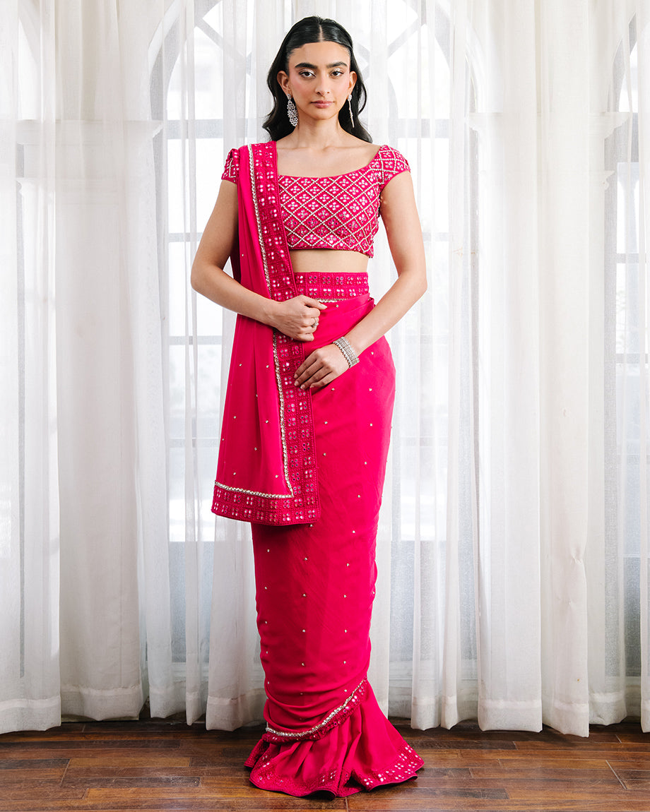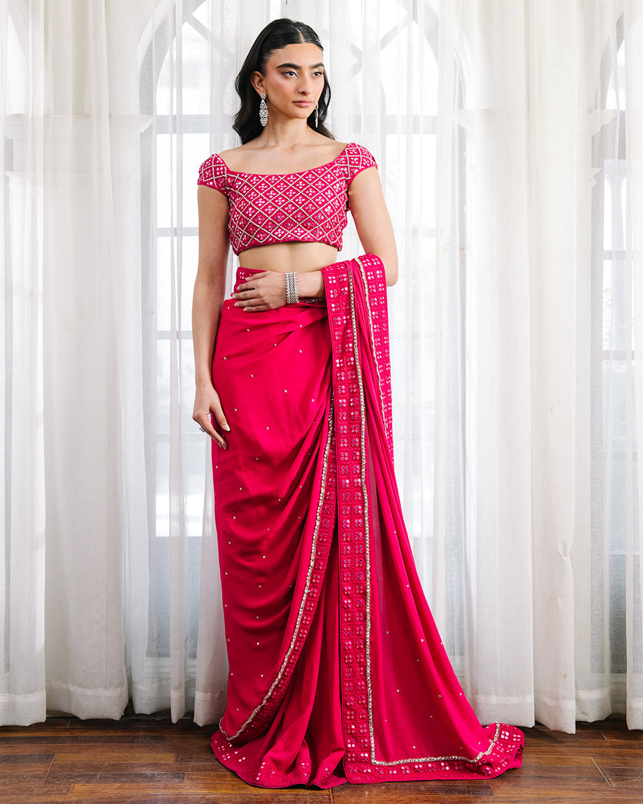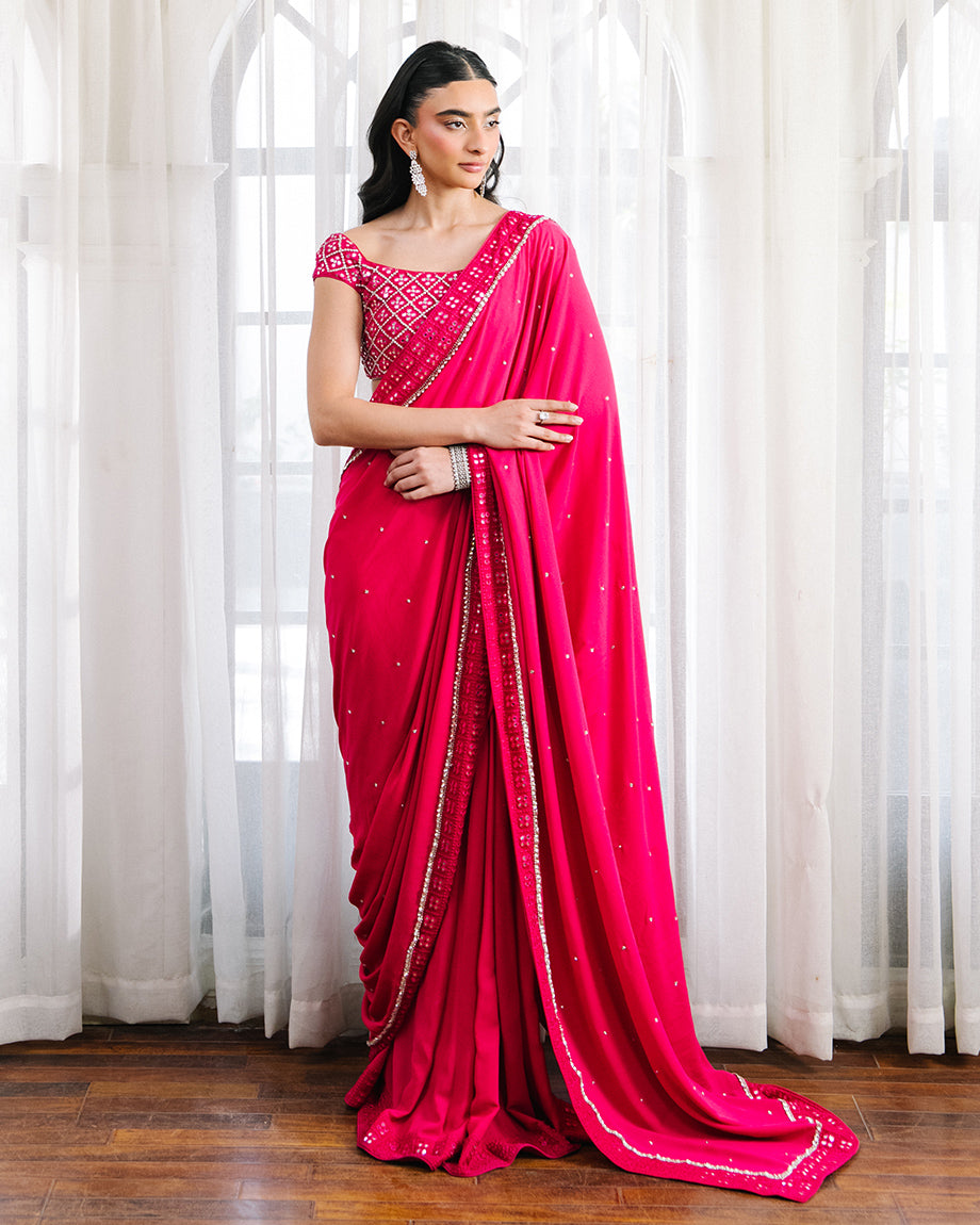 A hot pink set featuring a raw silk choli paired with a chiffon georgette saree and soft silk skirt. Accented with silver handwork throughout the choli and saree, designed for a tailored fit with layered flow, combining bold tones with graceful elegance.