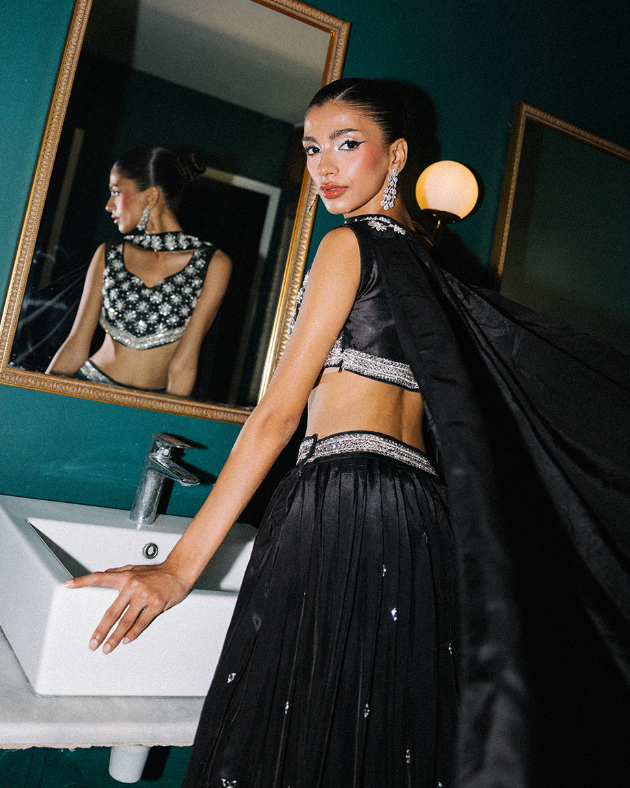 A striking black and silver lehenga choli set, featuring intricate hand-embroidered sheesha stone work on the choli and dupatta. Crafted in sheesha silk and soft silk, the look is elevated with sheesha stone lace detailing on the belt and choli front and back. Designed for a tailored fit with a side-zip choli and hook-fastened lehenga.