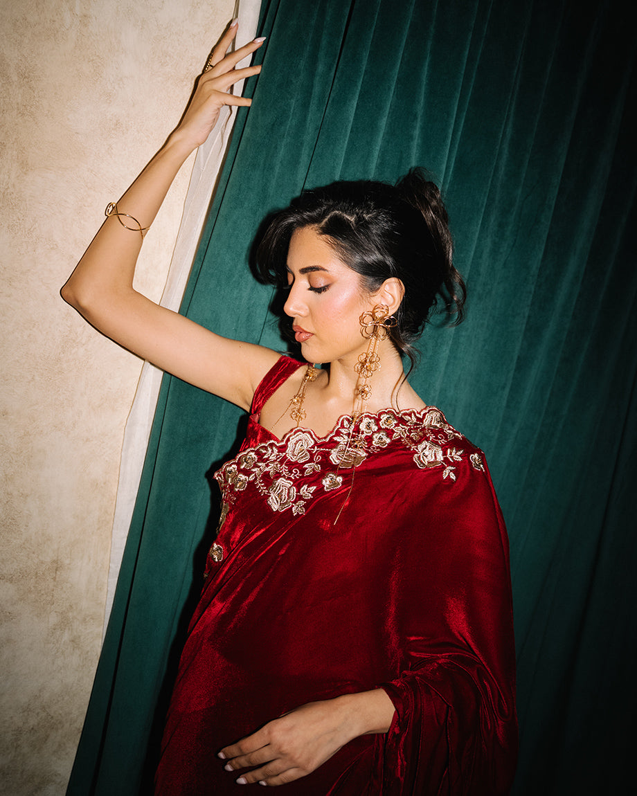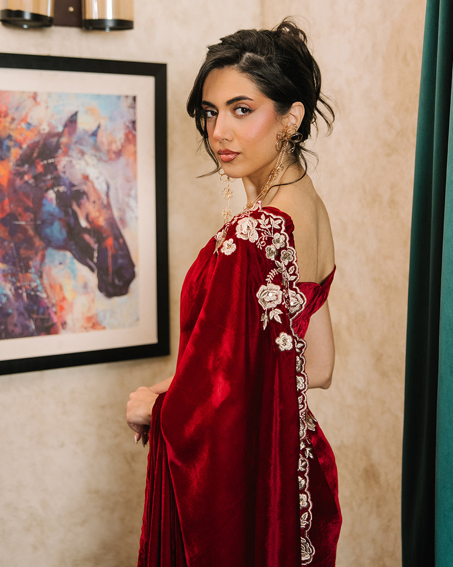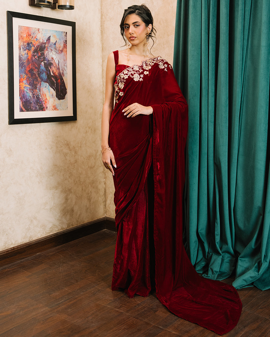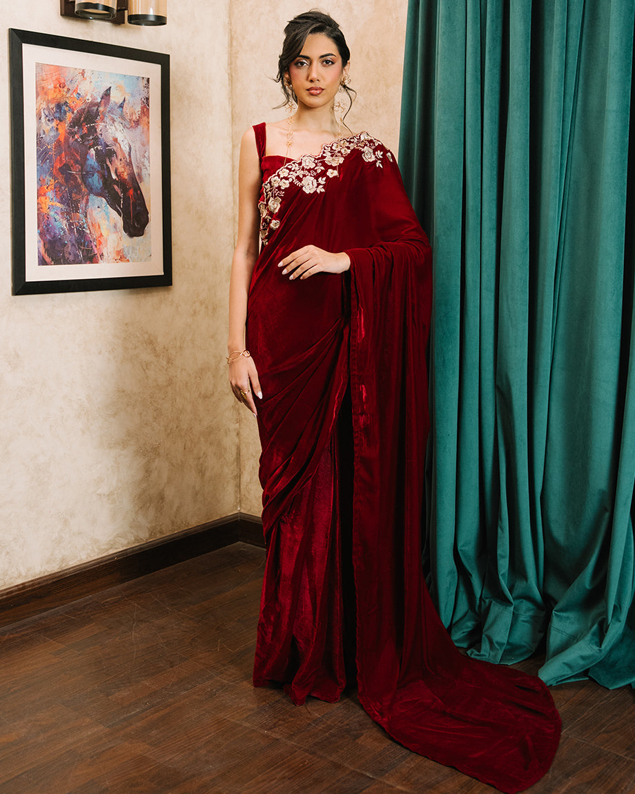 A maroon 3-piece set featuring a velvet saree and choli paired with a soft silk skirt. Detailed with dull gold zari and sequin handwork on the choli and saree, designed for a rich, opulent finish with structured layers for a regal appeal.
