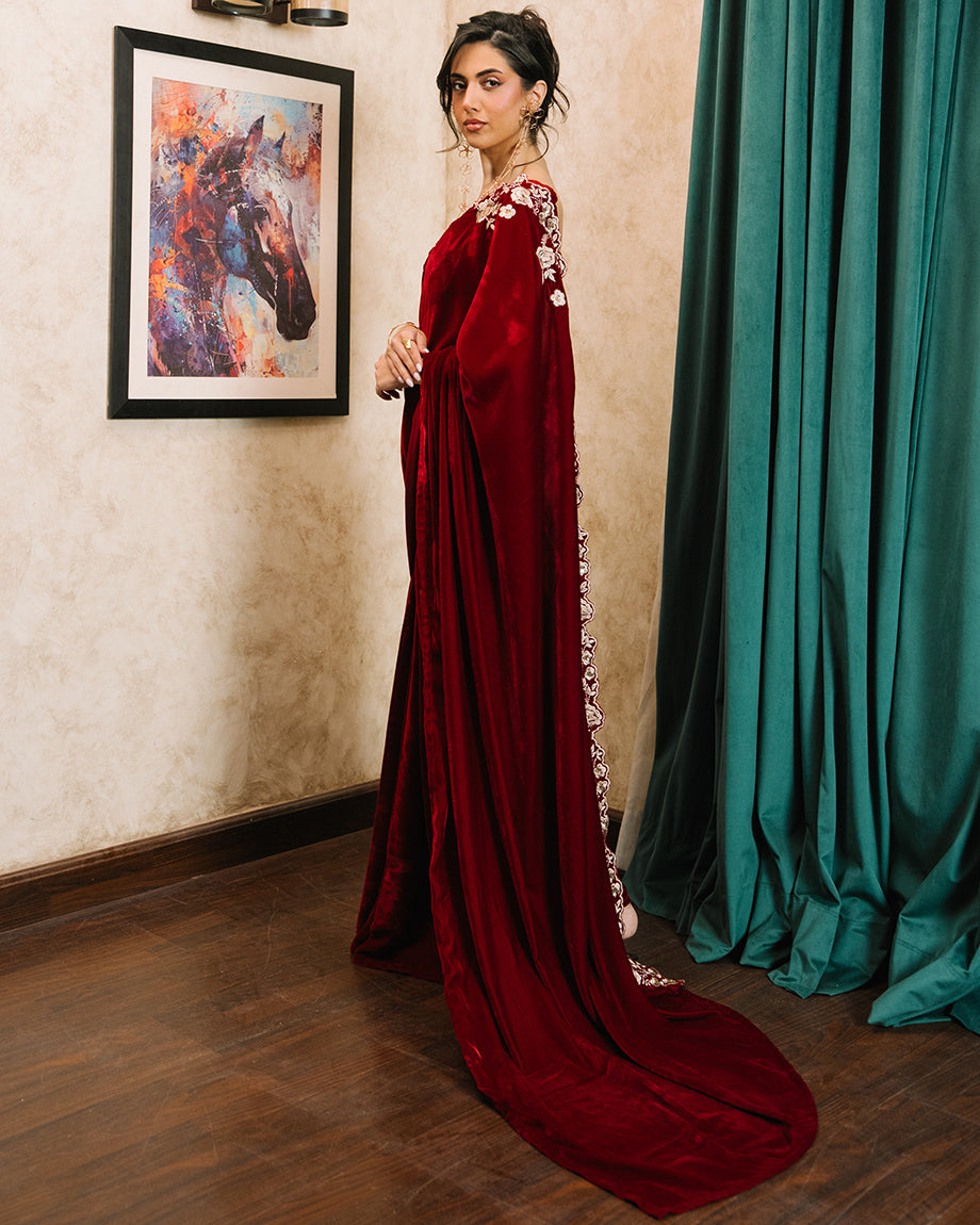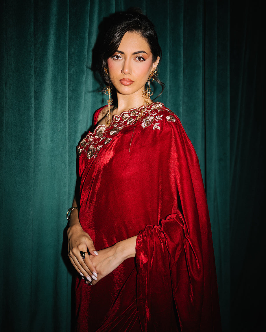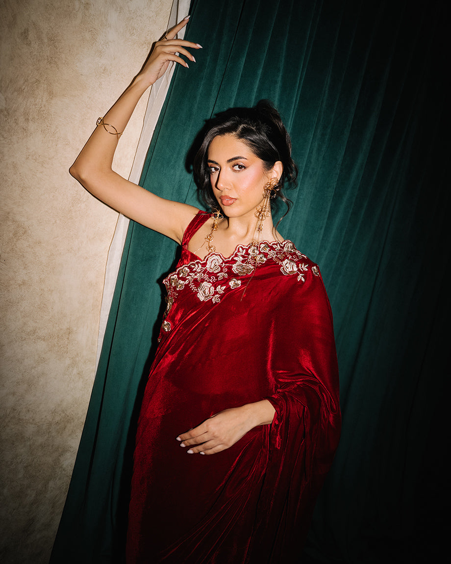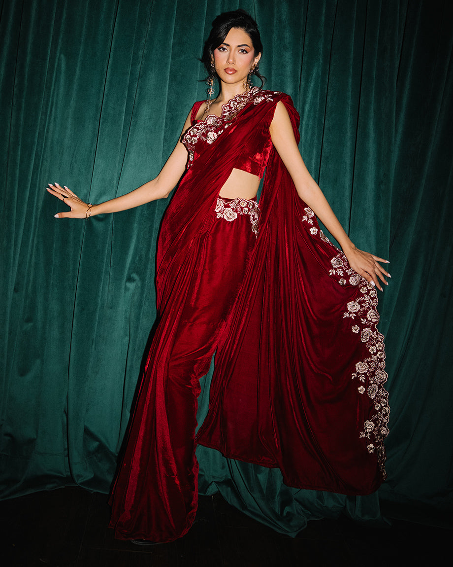 A maroon 3-piece set featuring a velvet saree and choli paired with a soft silk skirt. Detailed with dull gold zari and sequin handwork on the choli and saree, designed for a rich, opulent finish with structured layers for a regal appeal.