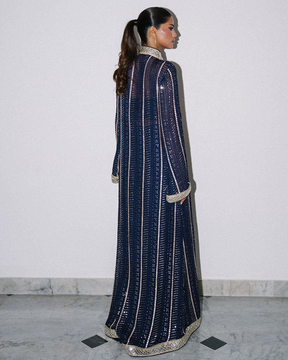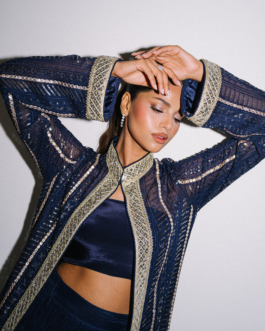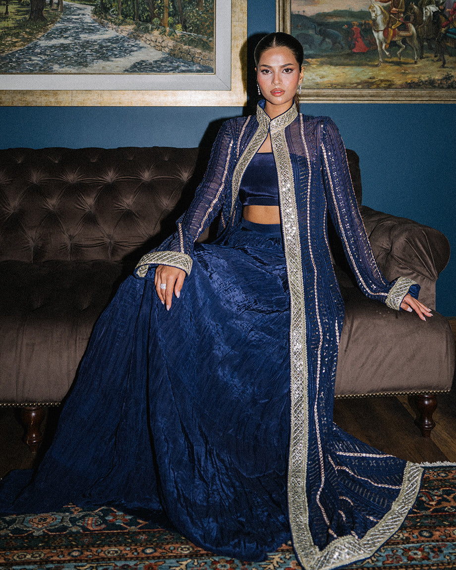 A deep navy blue set featuring a chiffon sequin-embroidered coat layered over a soft silk bandeau and crushed soft silk sharara. Finished with lace detailing throughout the coat and hooks for both open and closed styling. The sharara includes hidden hooks for a secure, flattering fit.