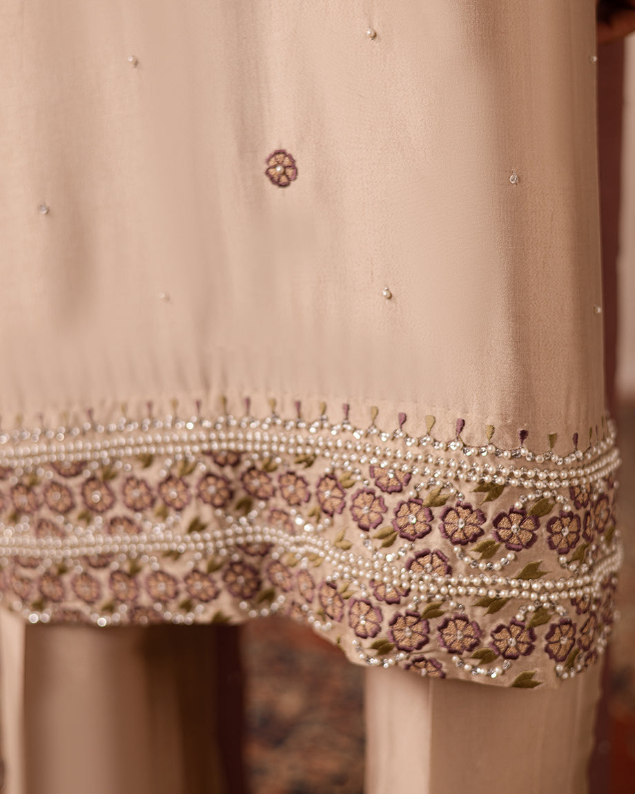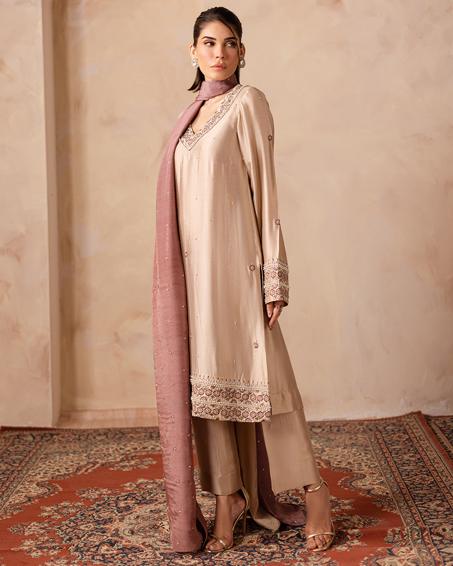 A classic sheesha silk outfit with embroidery and stone details on the neckline, daaman, and sleeves. Subtle stonework across the kameez adds a gentle shimmer, while an ombré dupatta in beige and purple shades completes the look with grace and poise.